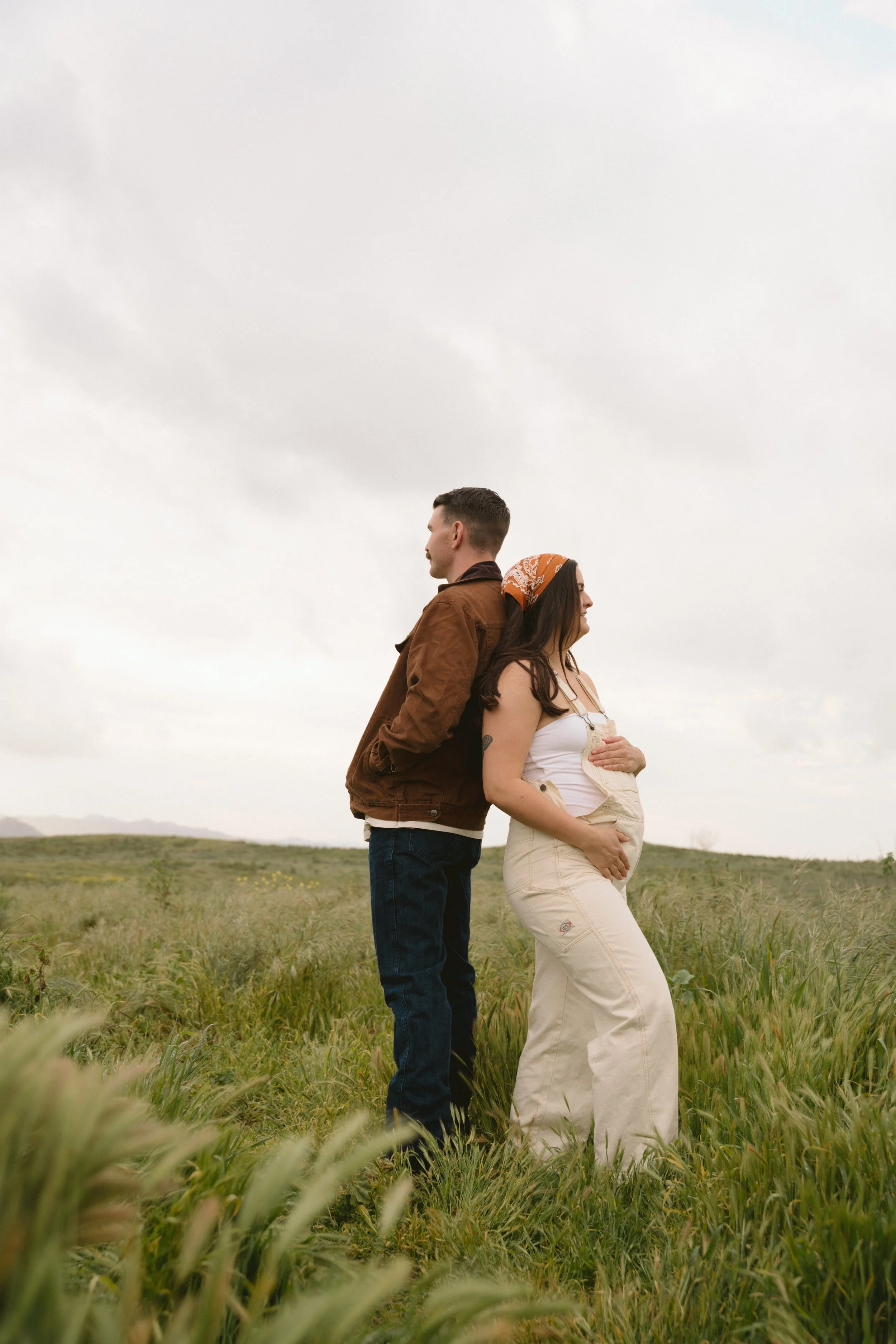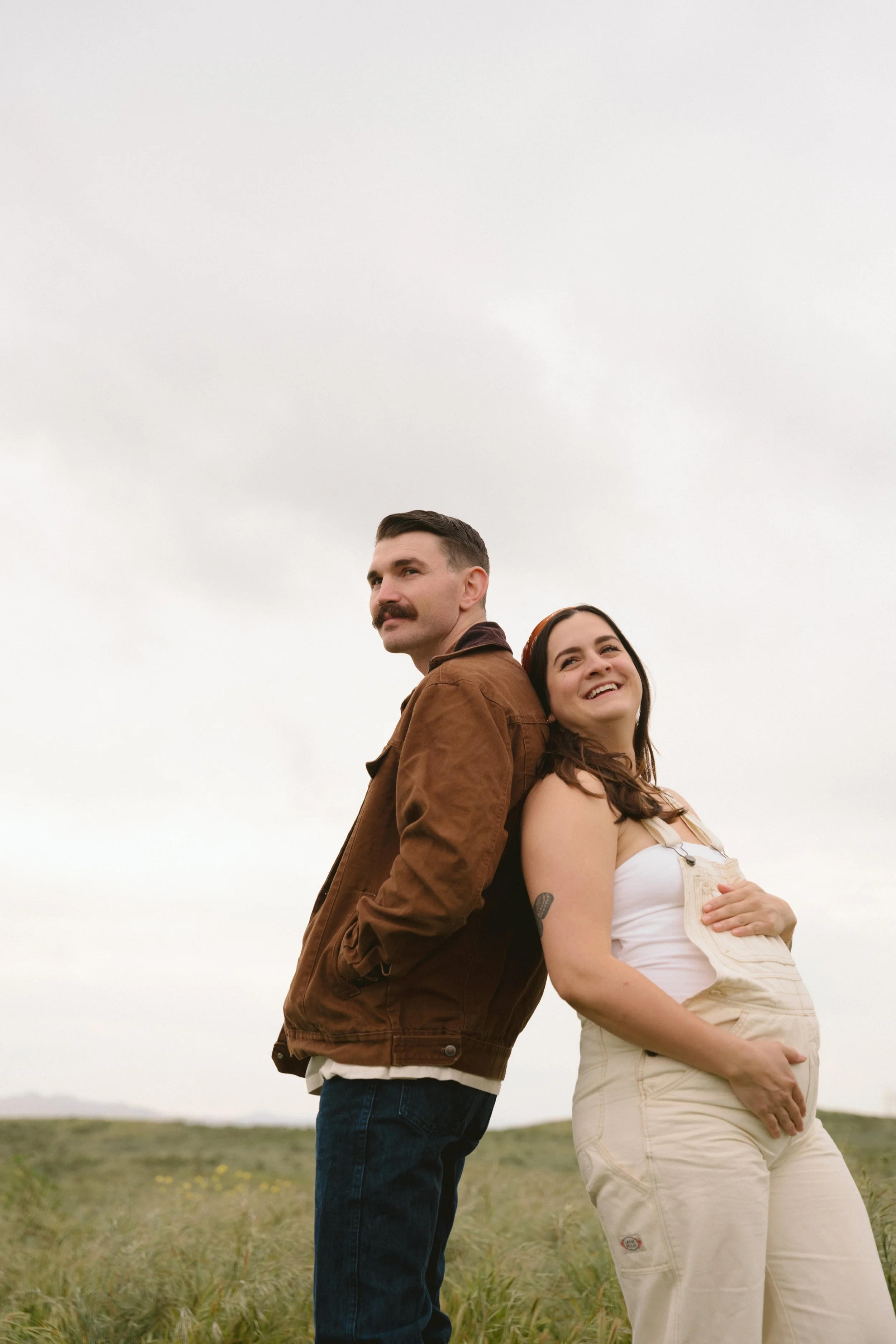 A pregnant woman stands back-to-back with a man in a grassy field. She is wearing a white tank top and overalls, holding her belly, while he is wearing a brown jacket and jeans, both looking away from each other.