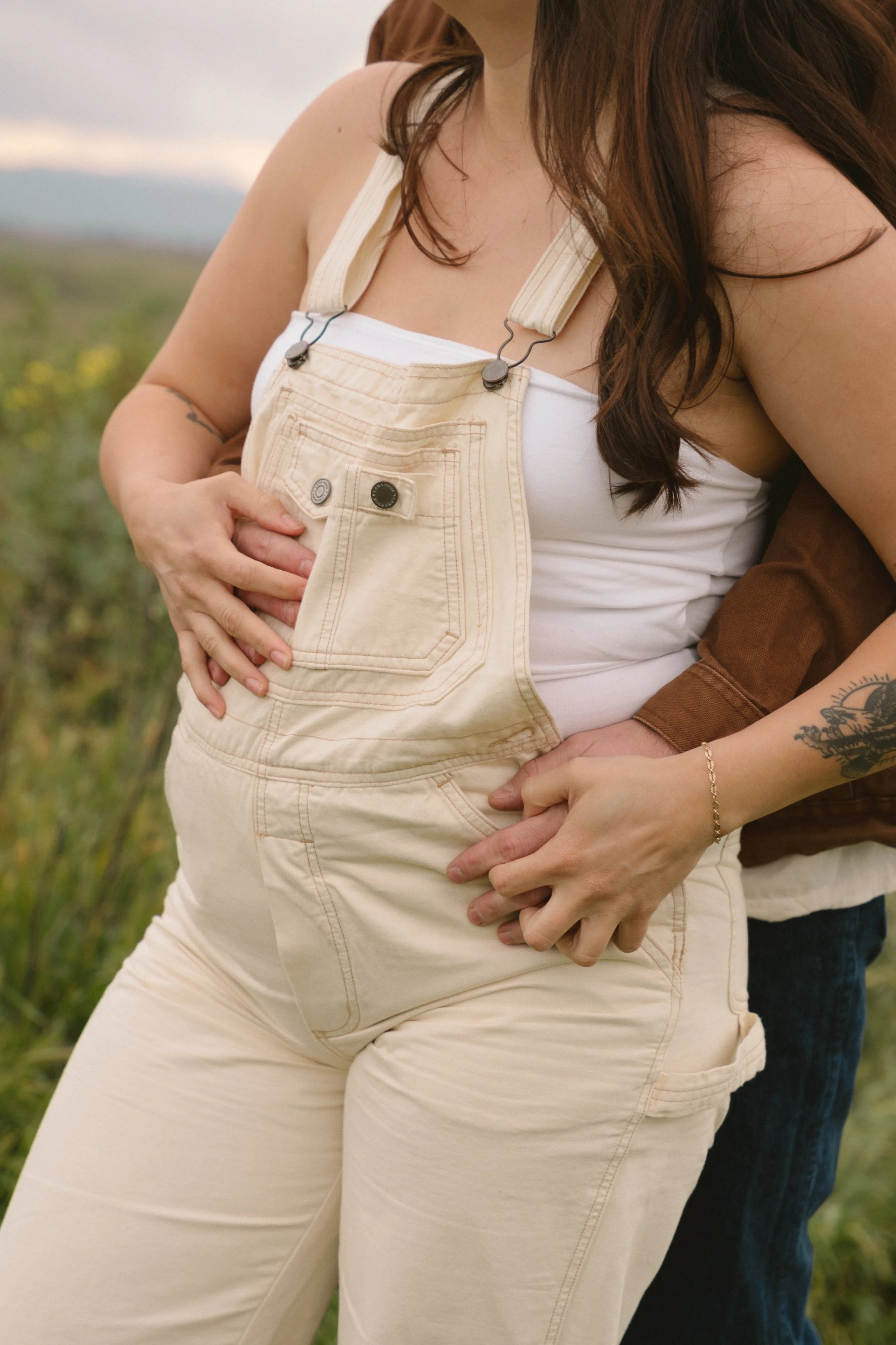 Close-up of a person wearing beige overalls with a white tank top, being embraced from behind in a grassy field.