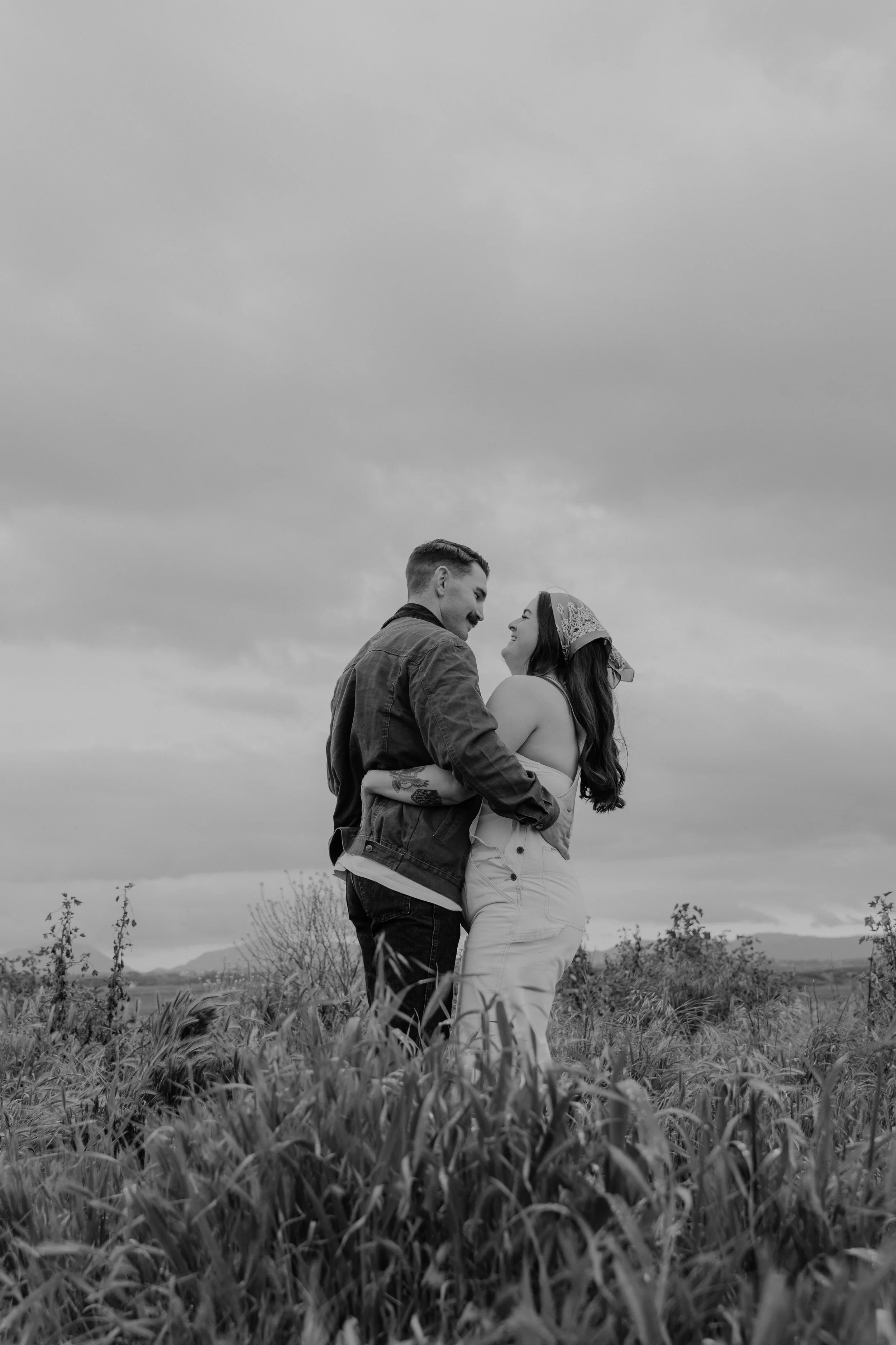 Black and white photo of a couple embracing in a field, with tall grass and overcast sky.