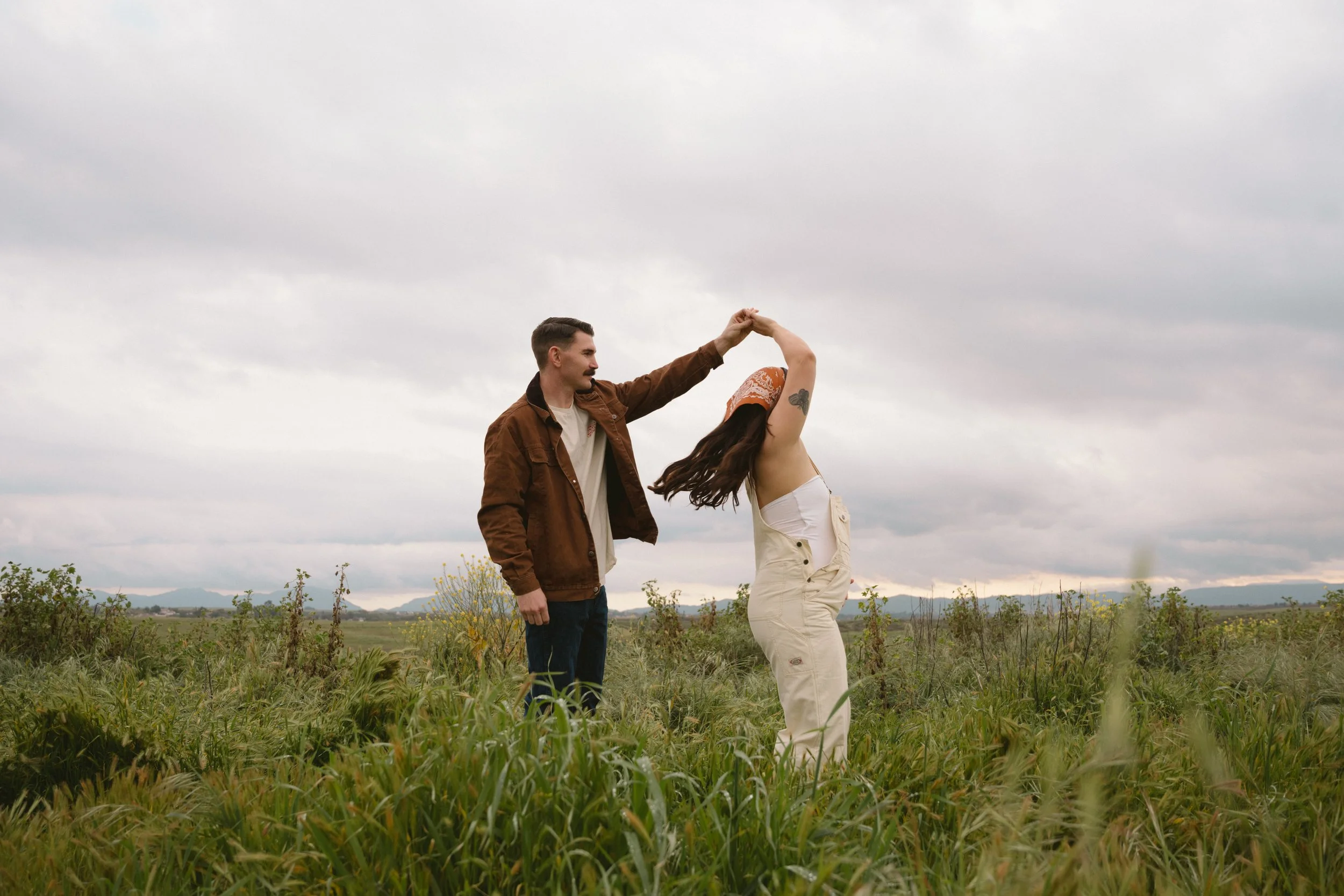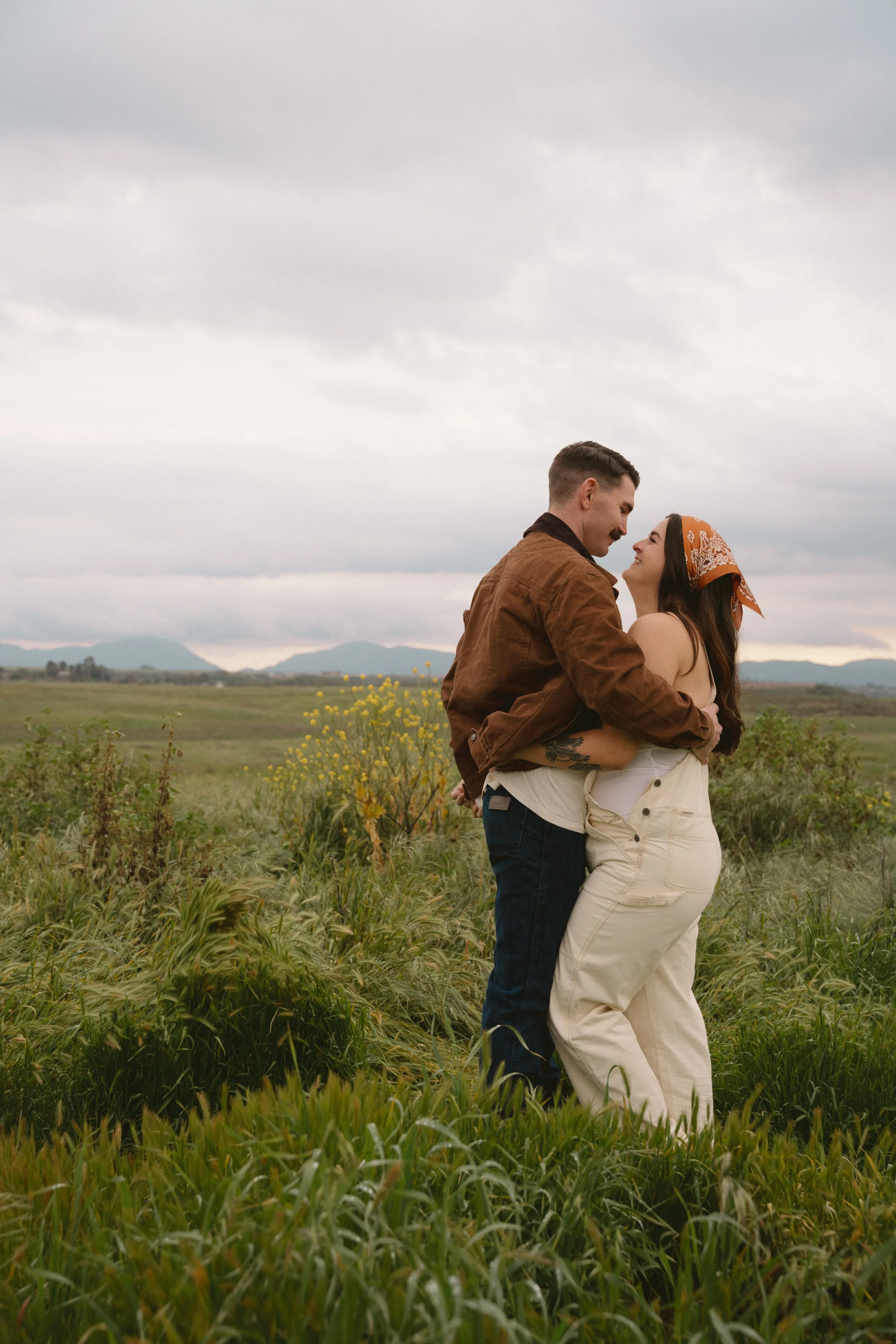 Couple embracing in a grassy field, with the woman wearing light overalls and a bandana, and the man in a brown jacket. The sky is cloudy, and there are distant hills.