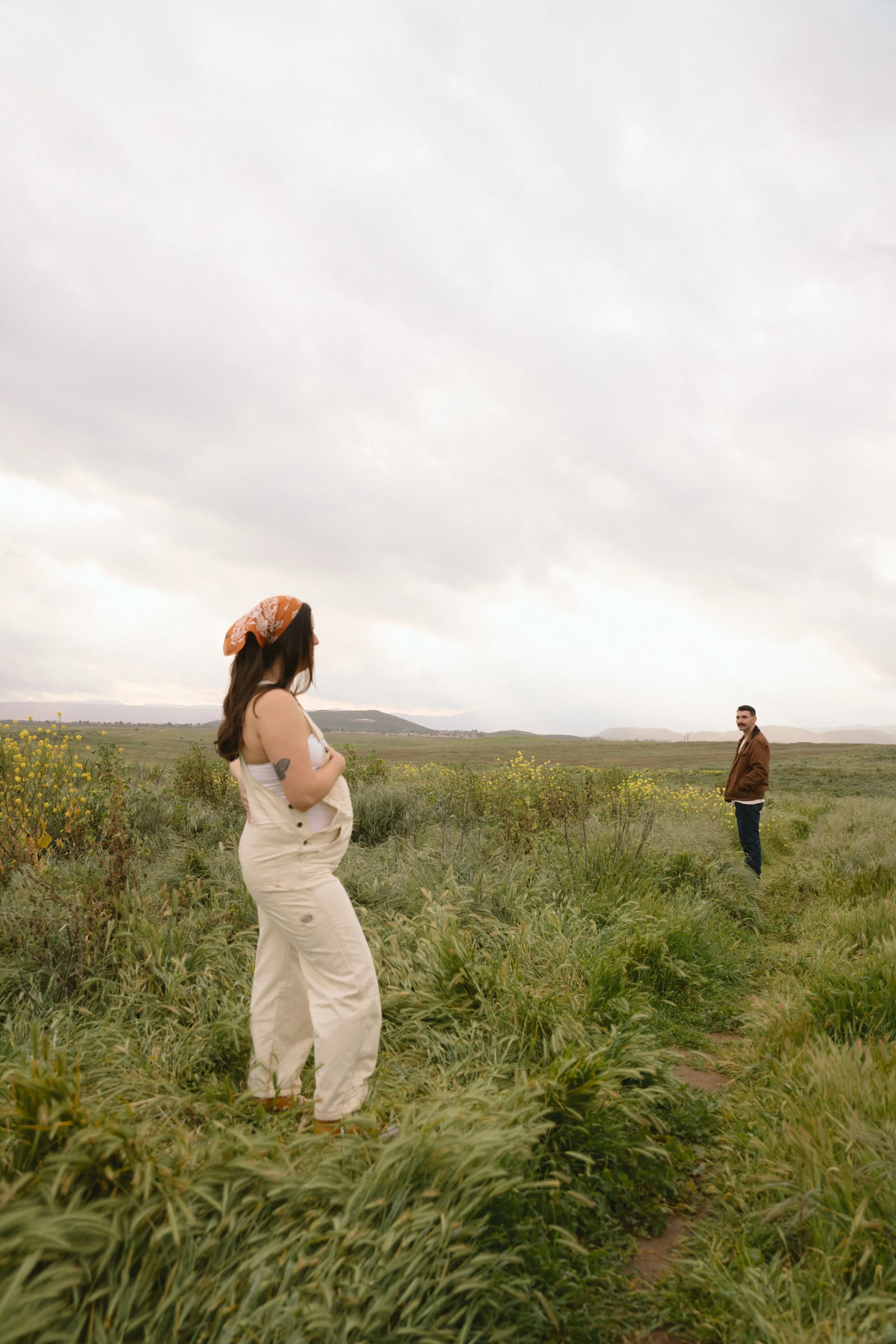 Pregnant woman in overalls standing in a grassy field facing a man in the distance; overcast sky.