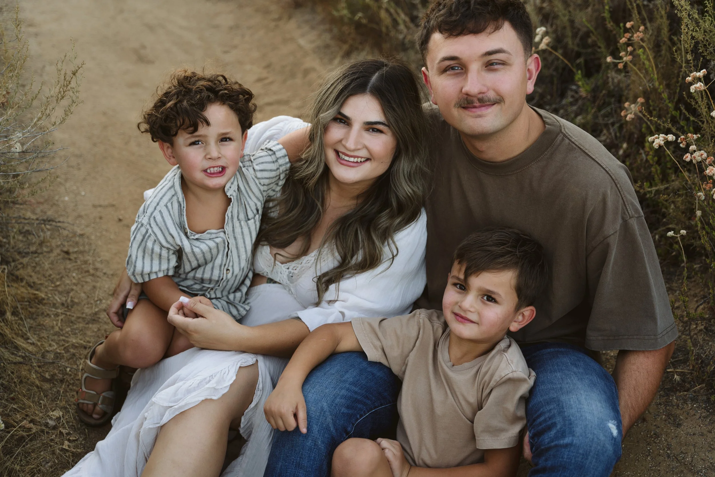 A family of four sitting together outdoors on a dirt path, surrounded by dry grasses and trees. The group includes two adults and two young children, all smiling and casually dressed.