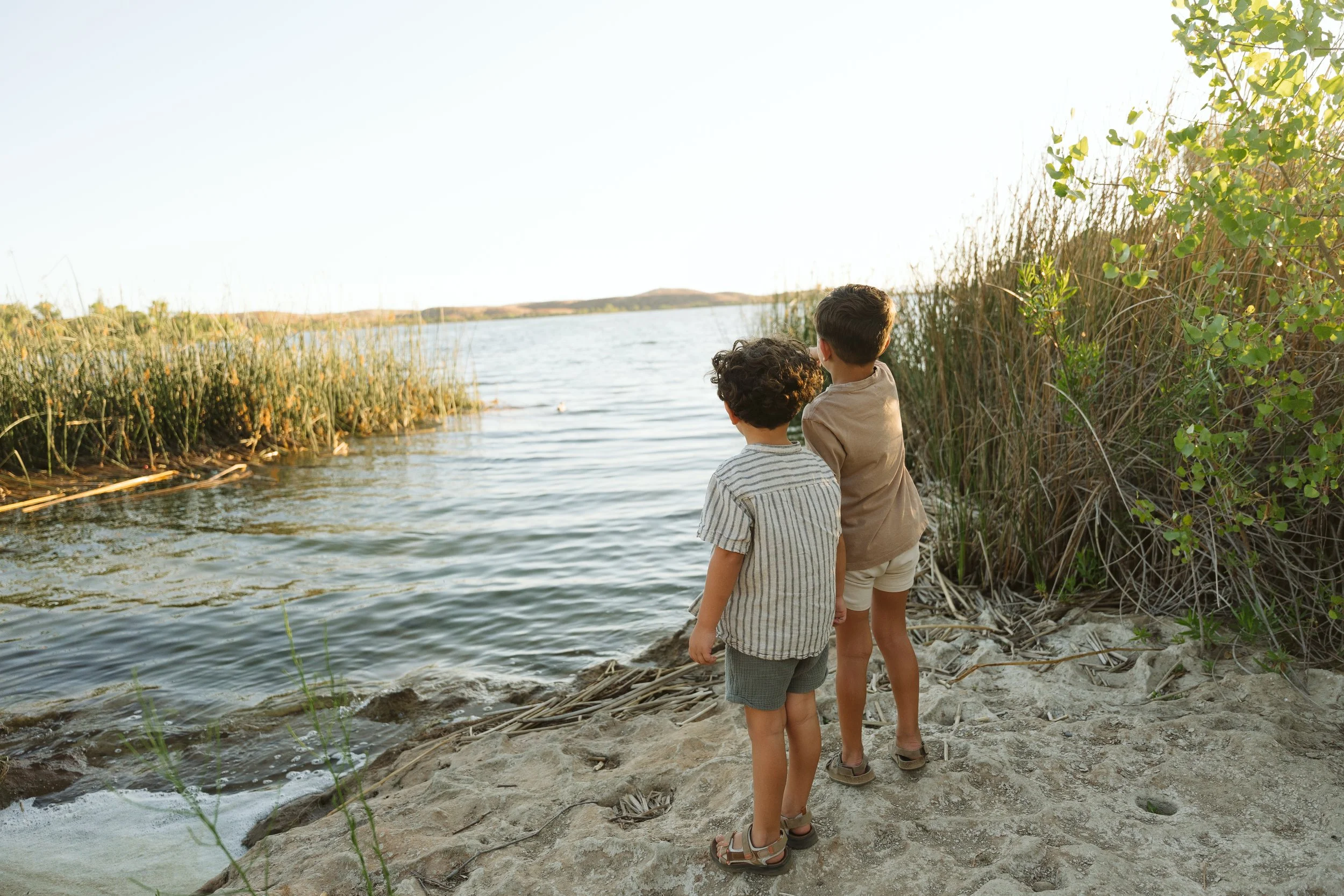 A family of four, including two adults and two children, standing in a field near a wooden fence, overlooking a lake at sunset.