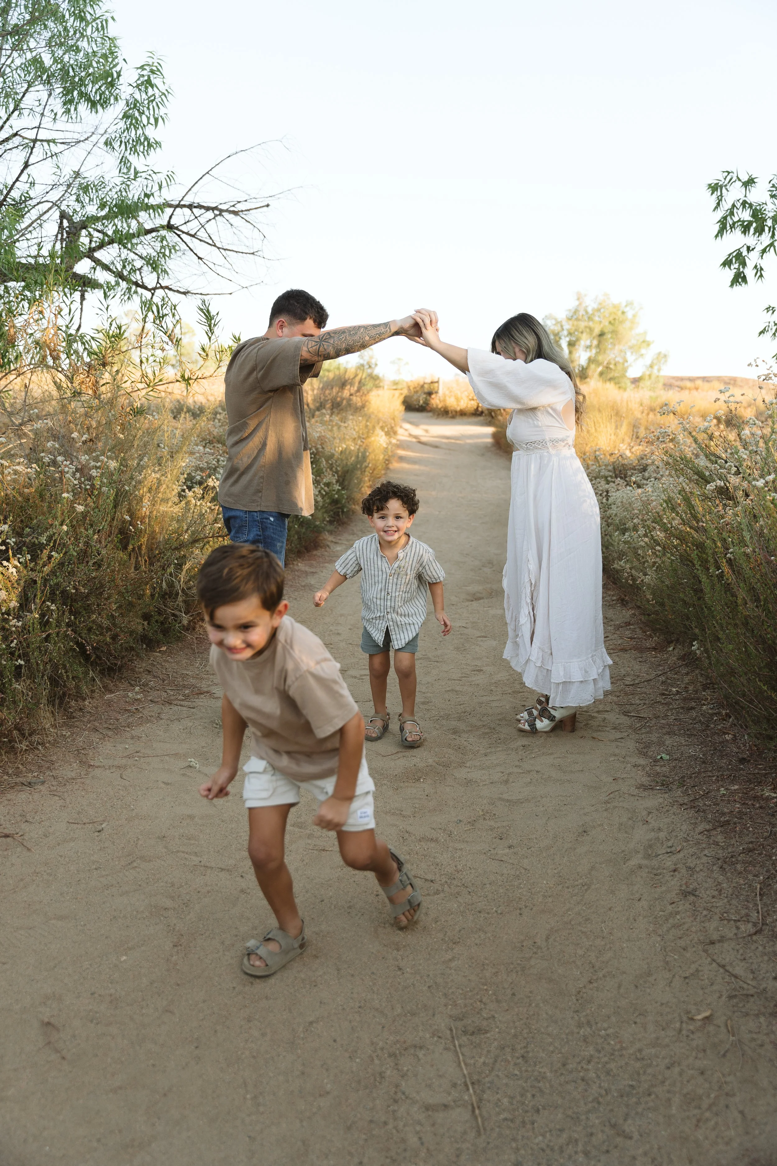 Family playing on a dirt path in a natural setting; parents holding hands creating an arch, while two children run underneath.