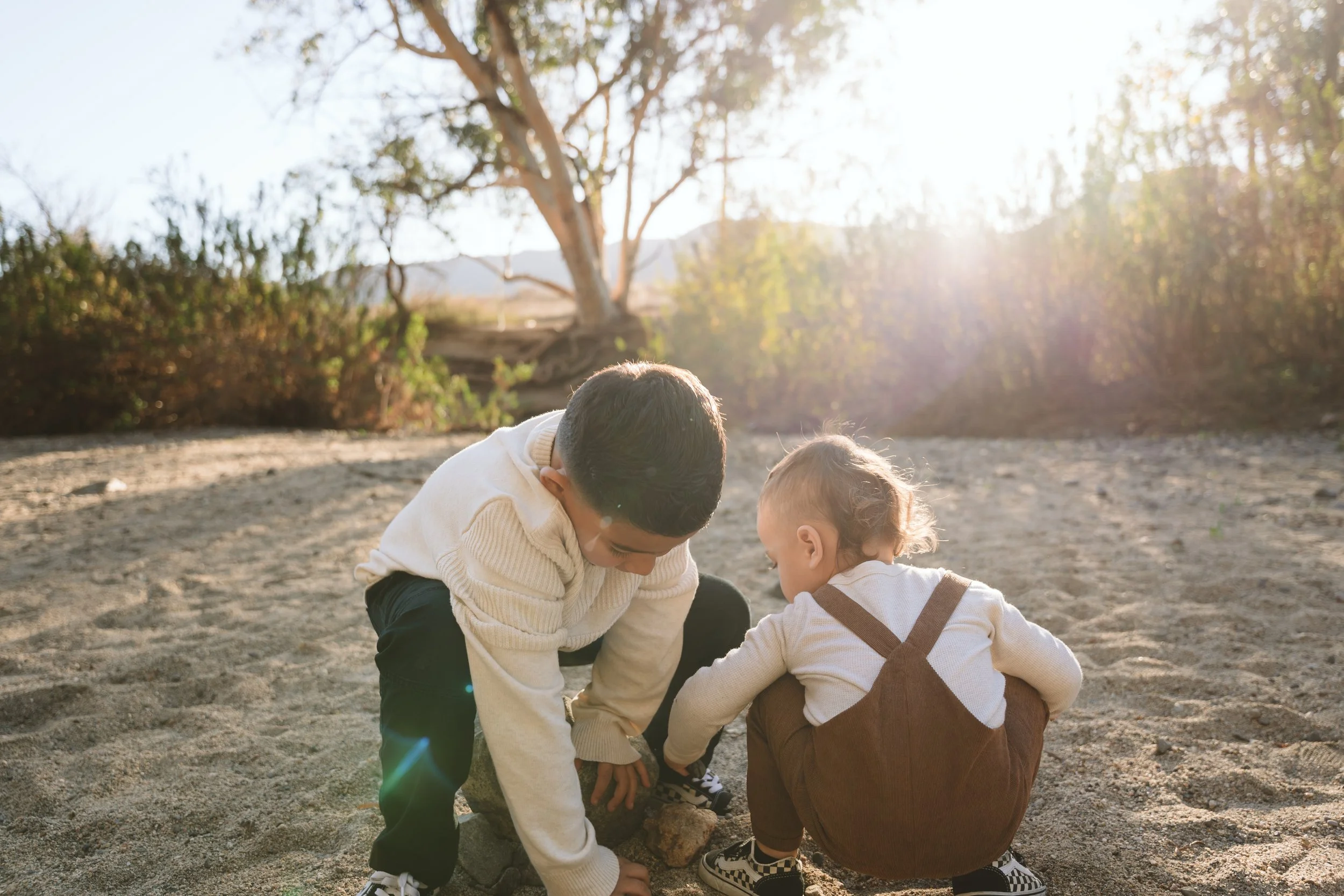 Two children playing on sandy ground near trees, with sunlight in the background.