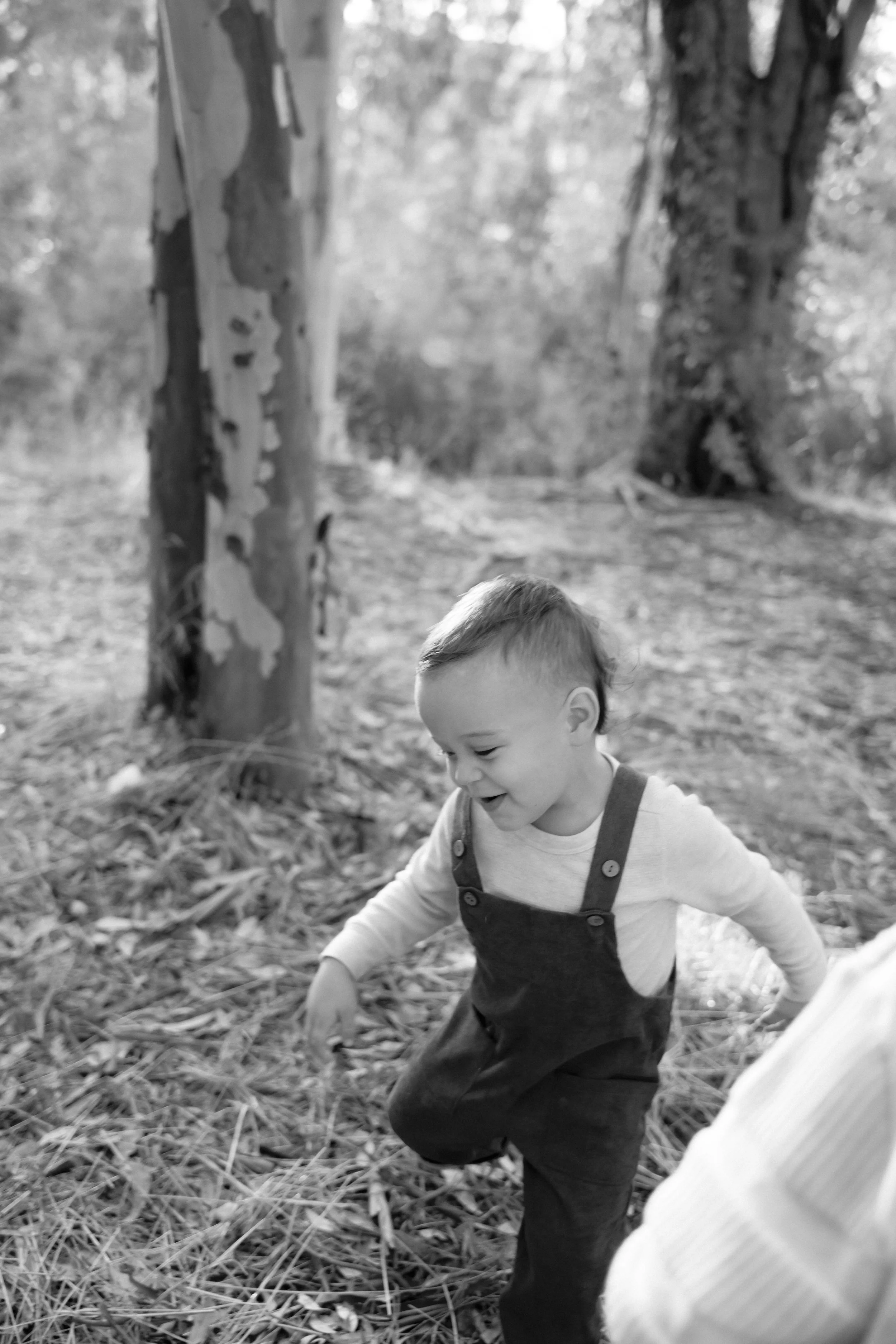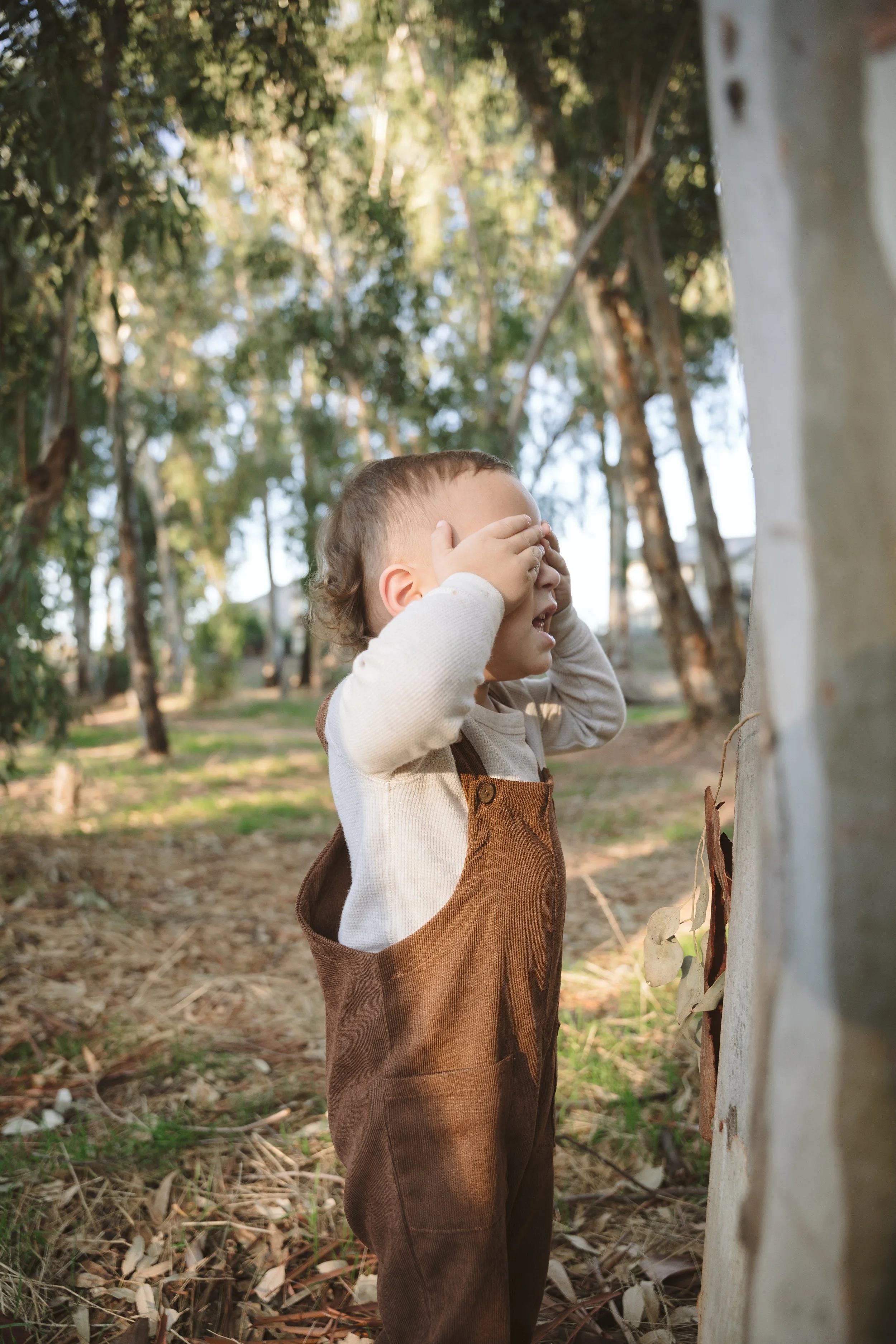 A child wearing overalls happily playing outdoors in a forest setting with trees in the background.