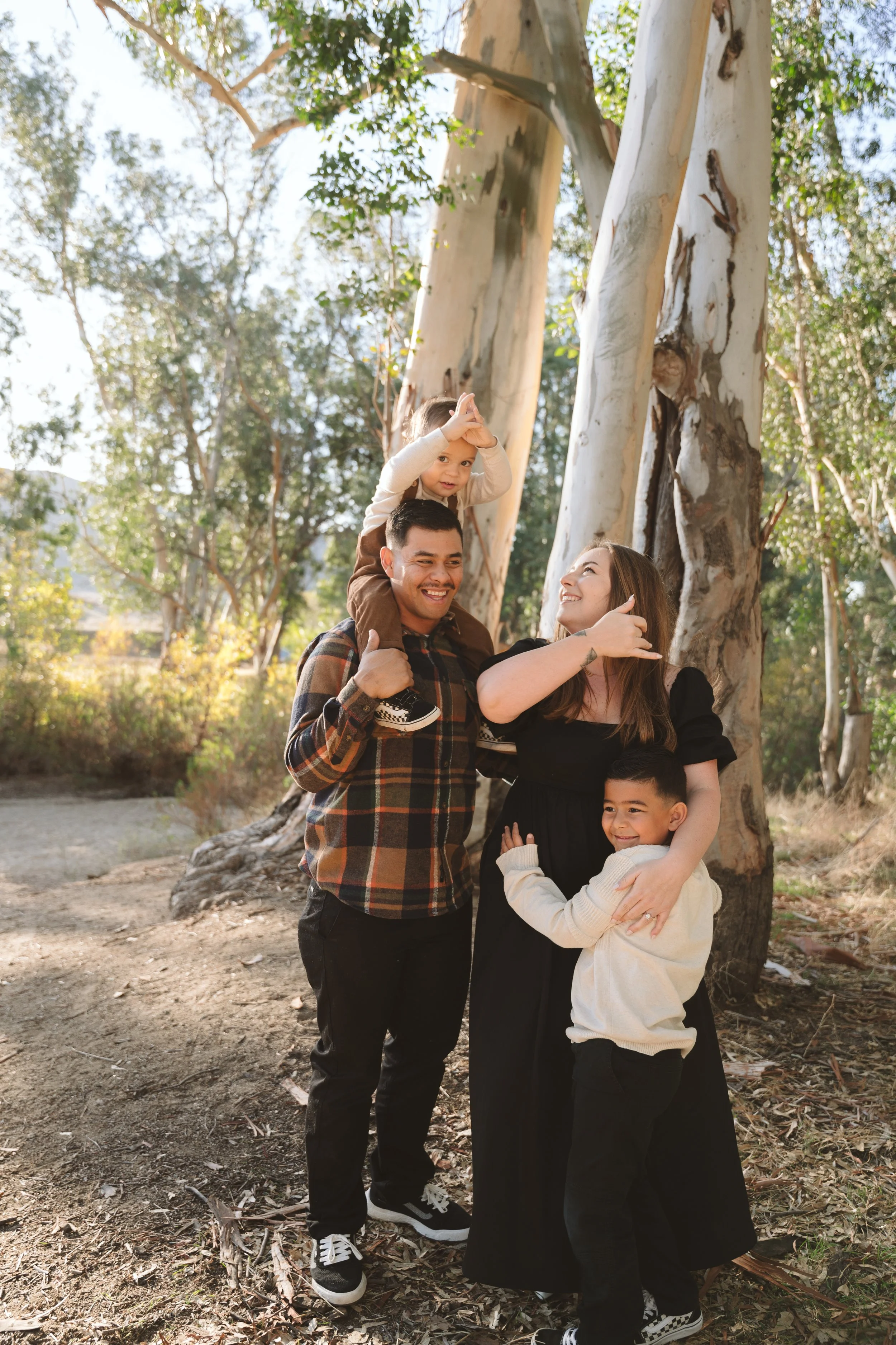 A family of four enjoying a moment in a wooded area with tall trees. A man holds a child on his shoulders while a woman and a younger child stand close, smiling and embracing.