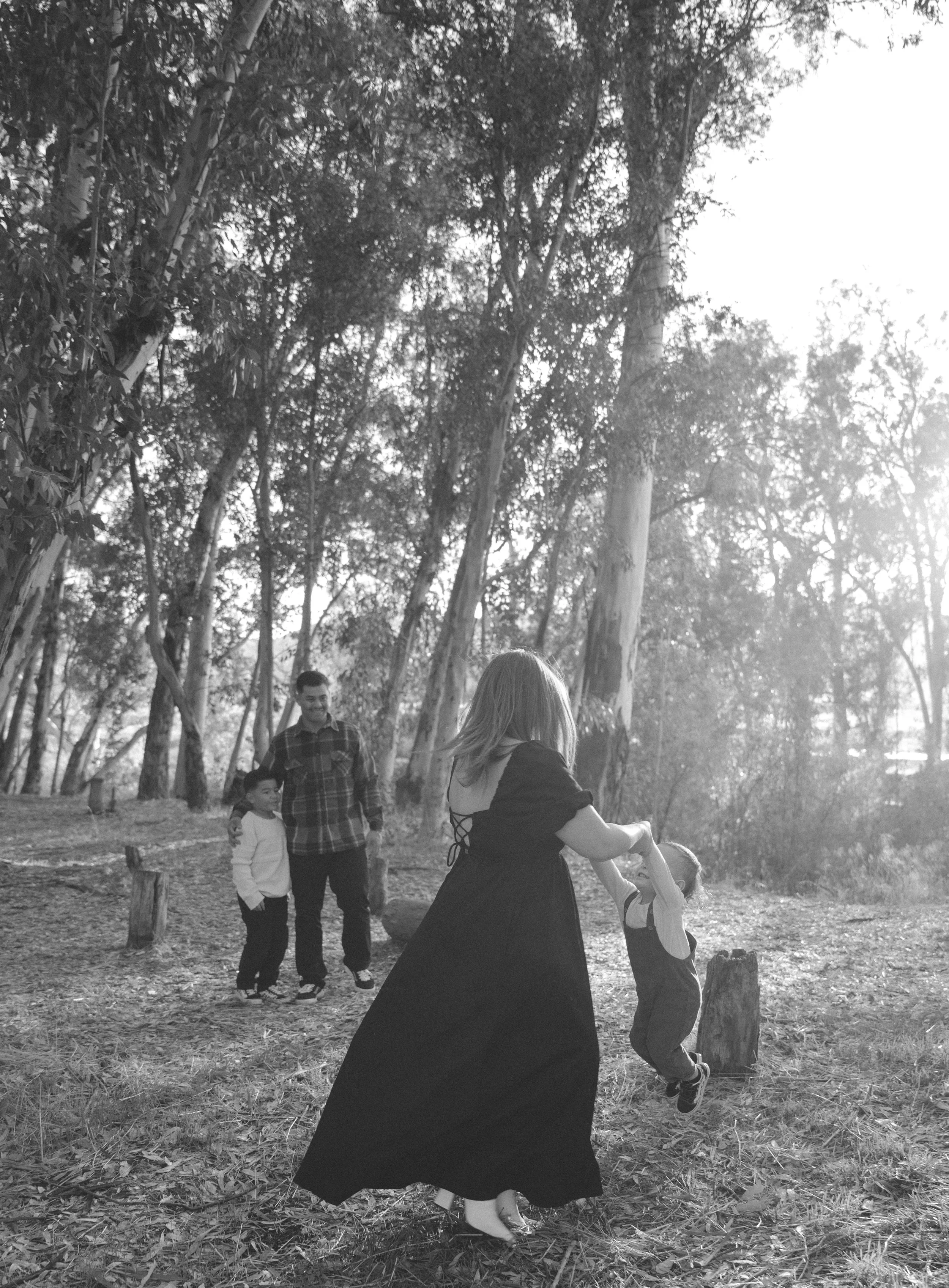 Black and white photo of a family in the forest, a woman in a dress swings a child by the arms, while a man with a young boy stands nearby among tall trees.